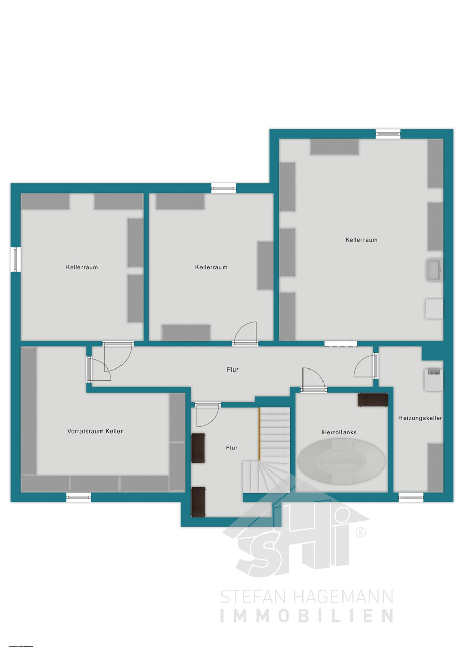 - Vollkeller mit Flur und fünf Kellerräumen (davon drei beheizt)