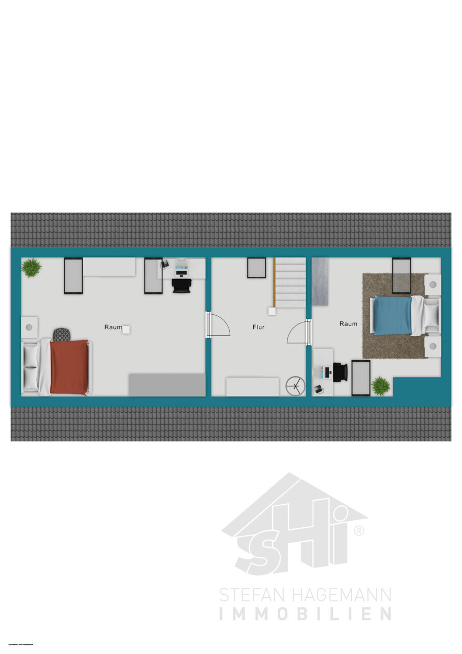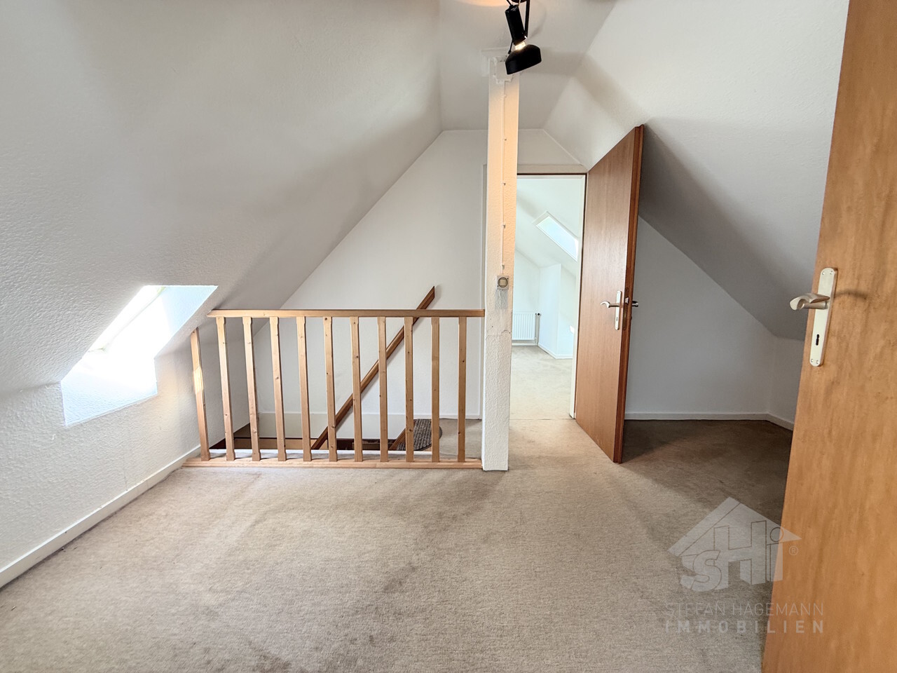 Benötigen Sie weitere Nutzfläche? Egal ob als Spielraum für Kinder, eigenes Büro oder als Hobbyraum? Über eine Holztreppe vom Zimmer neben dem Bad gelangen Sie in das Dachgeschoss des Hauses. Hier erwartet Sie weitere Fläche in zwei getrennten Räumen. Flur und die Räume sind mit Teppichboden ausgelegt Die Räume verfügen jeweils über zwei bereits modernisierte Velux-Fenster und sind beheizt.