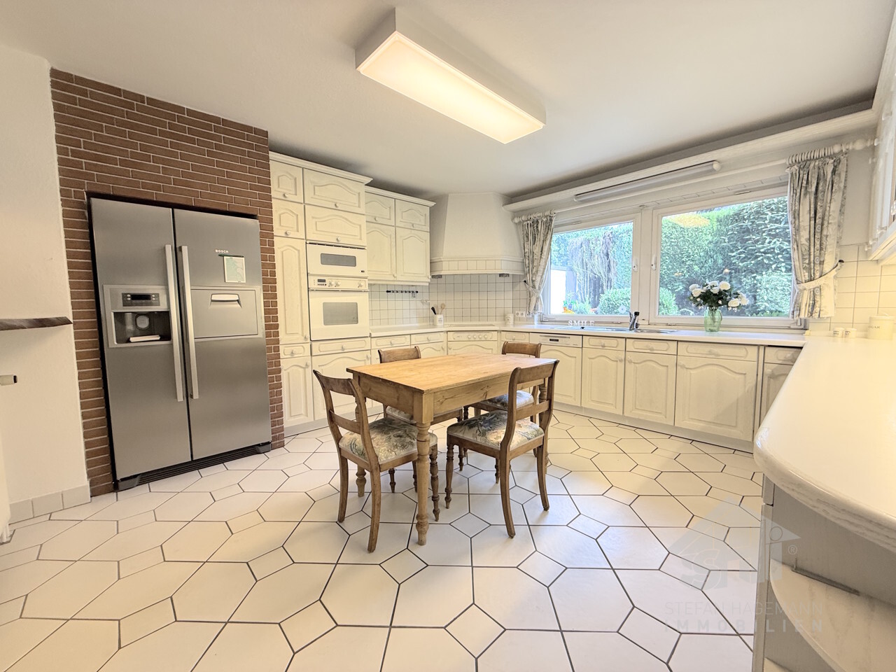 Die rund 17 m² große Wohnküche ist mit einer hellen Einbauküche im Landhausstil ausgestattet. Hier darf fleißig gekocht werden während die Kinder am Esstisch sitzen und Hausaufgaben machen. Natürlich können Sie die Einbauküche auch modernisieren und ganz nach Ihrem persönlichen Geschmack mit schicken Einbauschränken und modernen Geräten ausstatten.