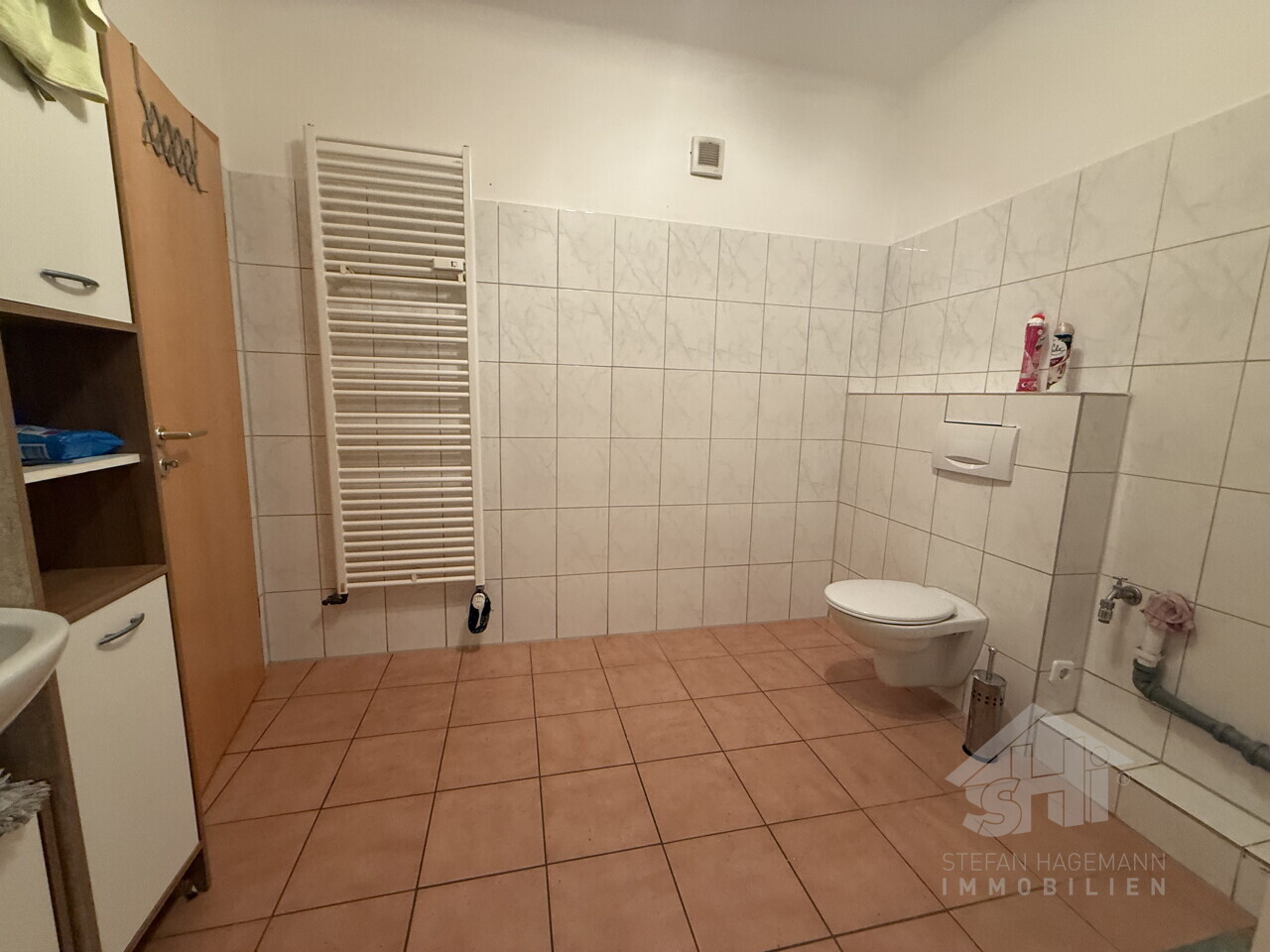 - Bad mit Dusche, Wanne, Handtuchheizkörper und Waschmaschinenanschluss