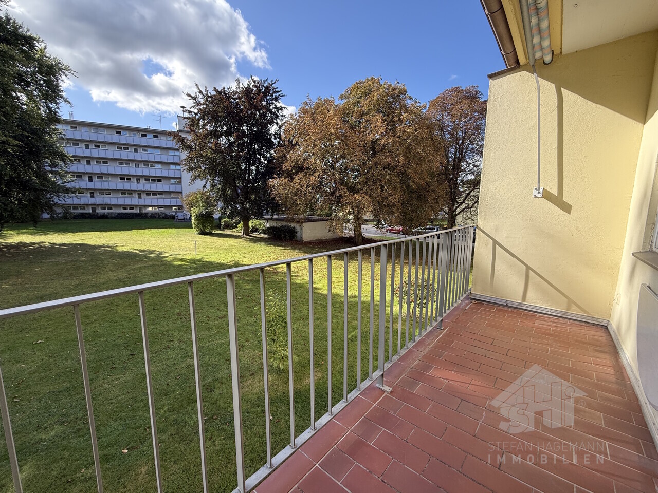 - Loggia mit Markise und Südausrichtung - Blick auf eine Wiese