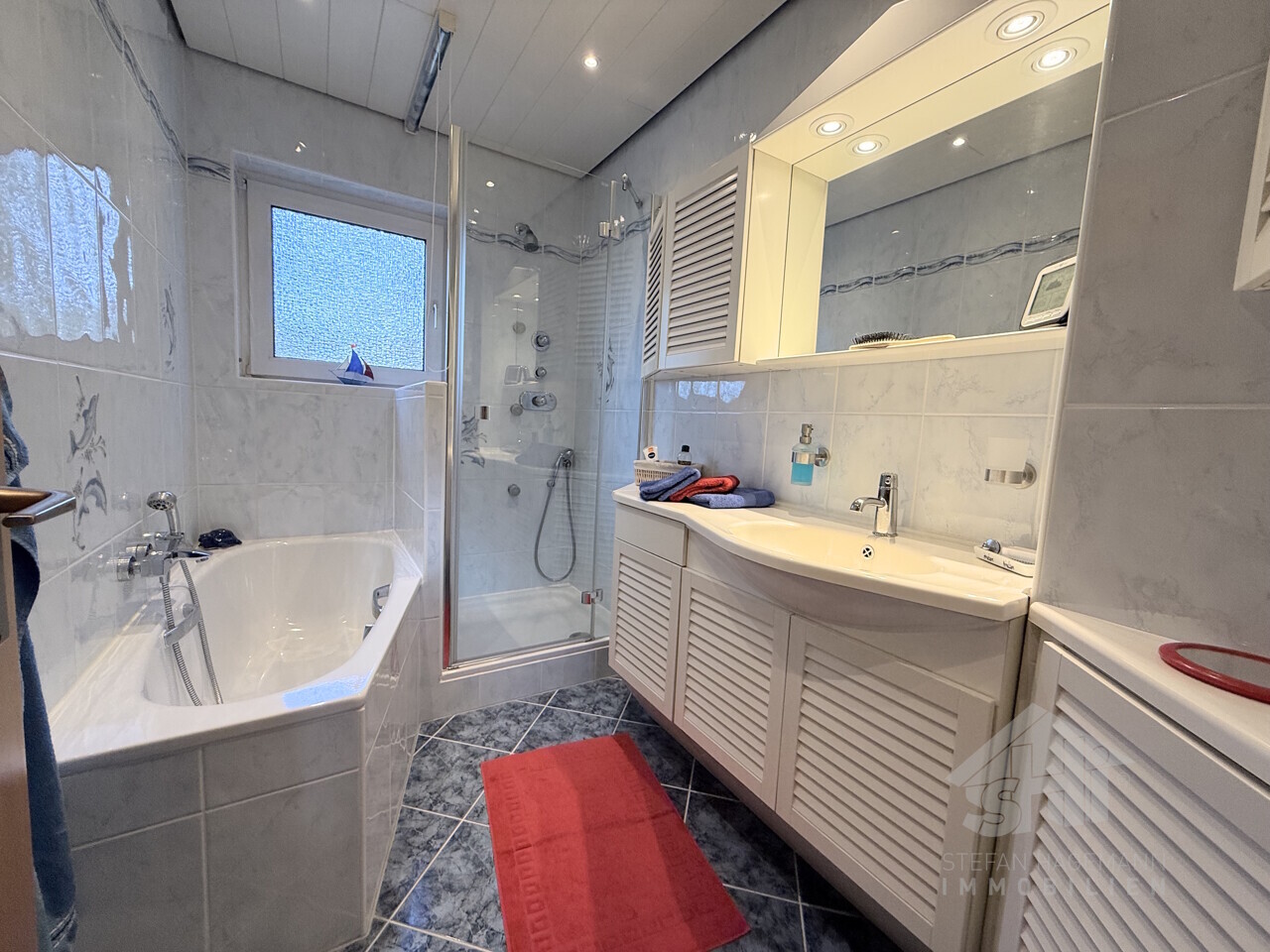 - Bad mit Dusche, Wanne, Waschbecken und Handtuchheizkörper
