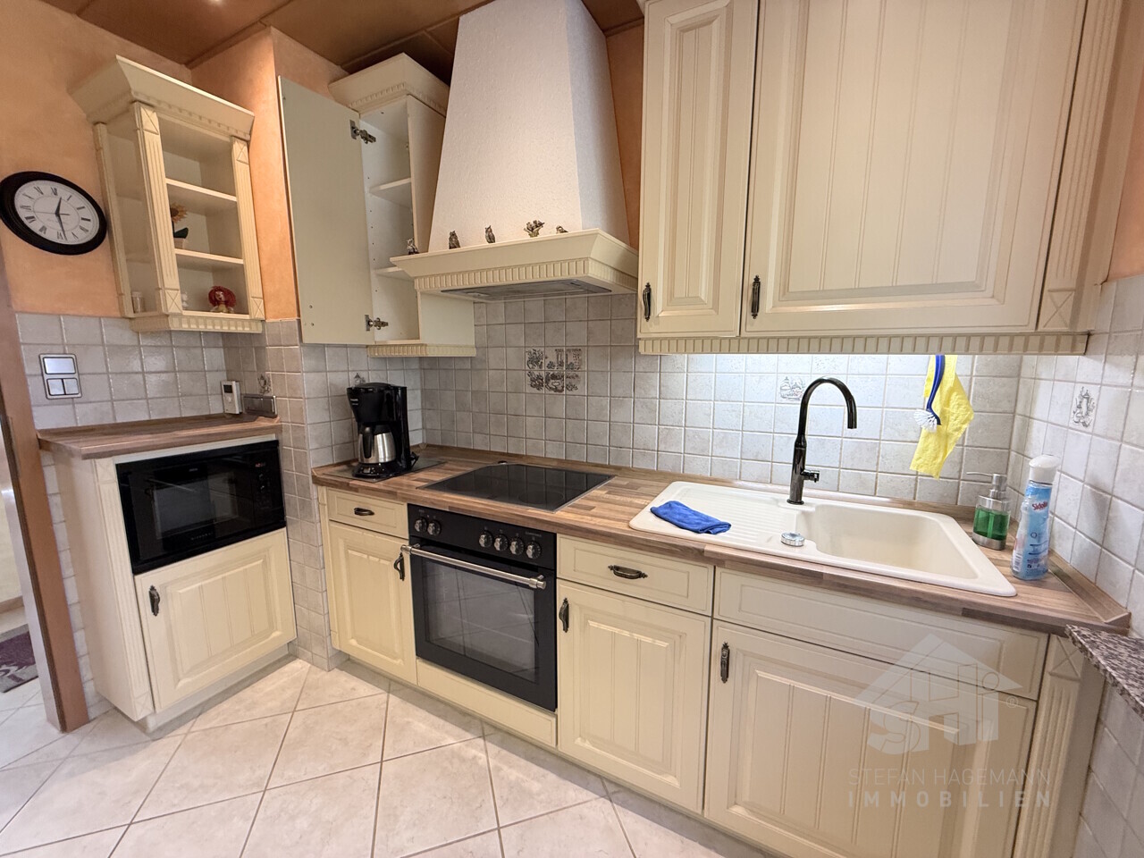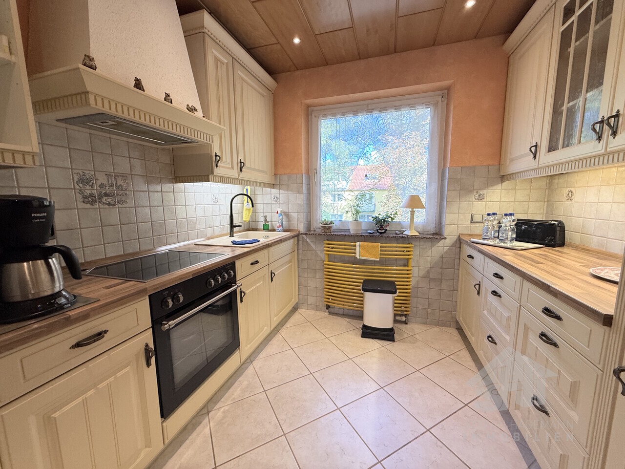 In der gepflegten, hellen Einbauküche im Landhausstil können Sie Ihre Kochkünste zeigen und neue Rezepte ausprobieren. Reichlich Arbeitsfläche und viel Stauraum sorgen dafür, dass Sie sich kulinarisch austoben können.