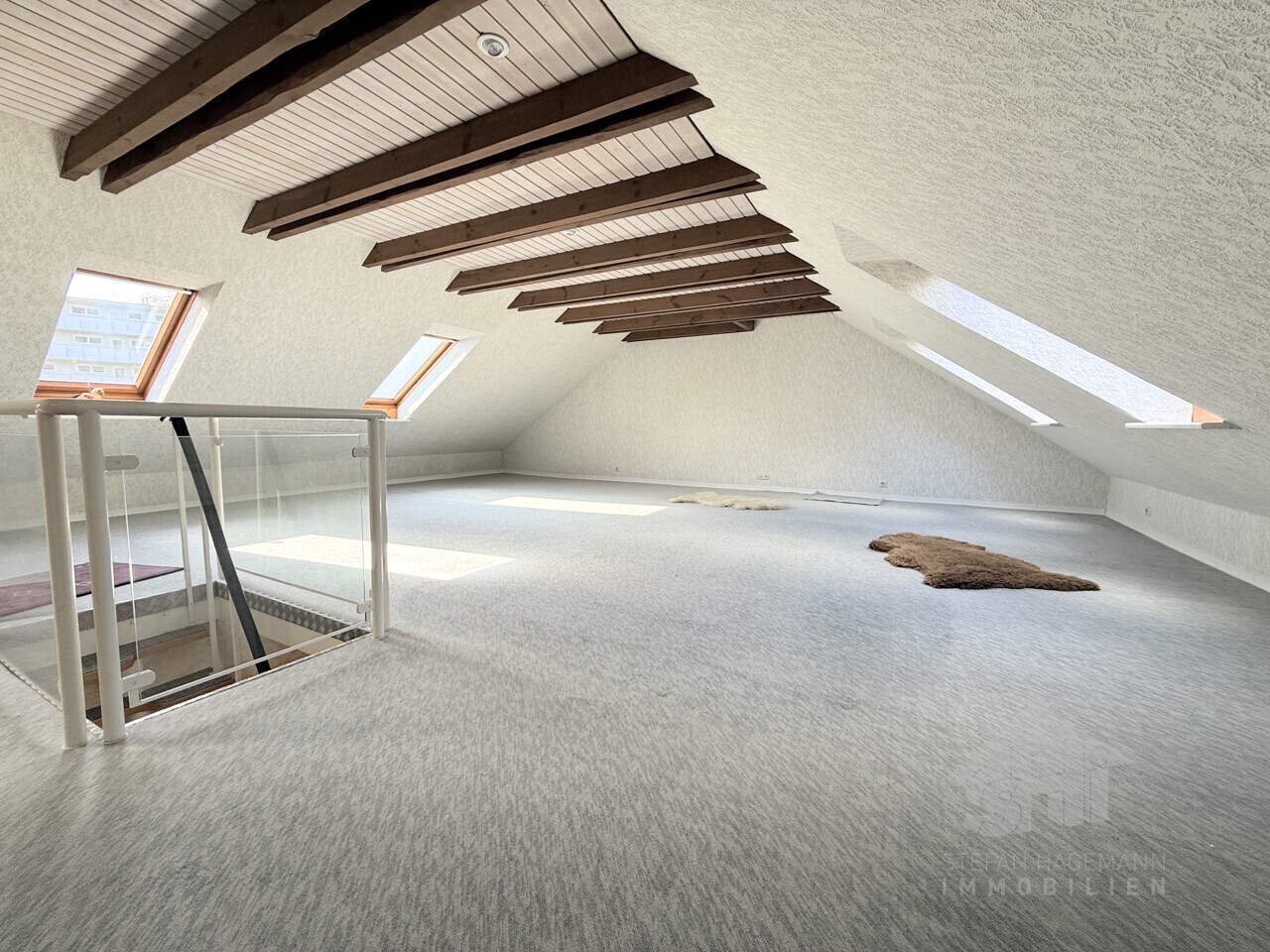 - großer, heller Raum mit Dachflächenfenstern und mit Teppichboden belegt