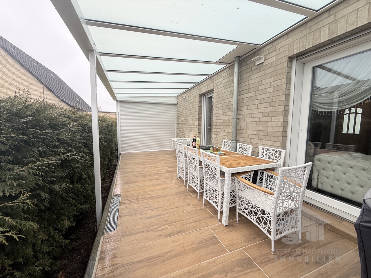 Im Sommer genießen Sie Ihren Feierabend auf der großen, überdachten Terrasse in Süd-Lage, die Sie sowohl vom Wohnzimmer als auch von der Wohnküche aus erreichen.