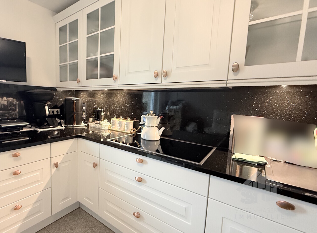 Die moderne Einbauküche fügt sich harmonisch in das Wohnkonzept ein und bietet eine solide Grundlage für den täglichen Bedarf sowie für das Kochen in geselliger Runde.